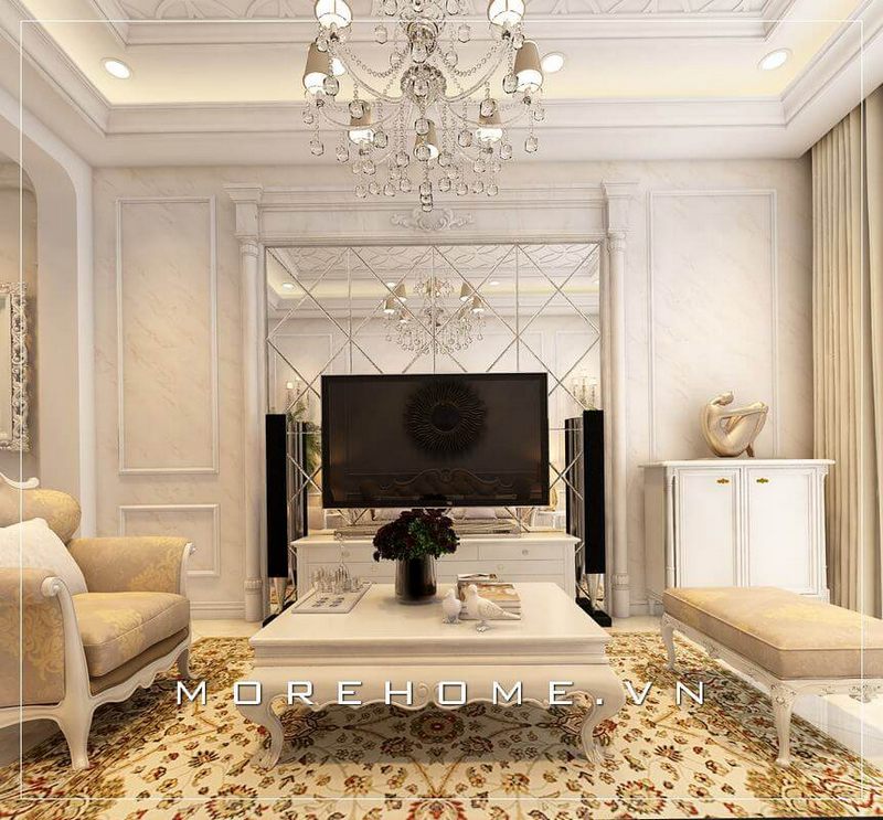 Trang trí nội thất biệt thự đẹp sang trọng bởi điểm nhấn là bức tường sử dụng gương ghép ô tạo cảm giác phòng khách rộng rãi và sang trọng hơn.