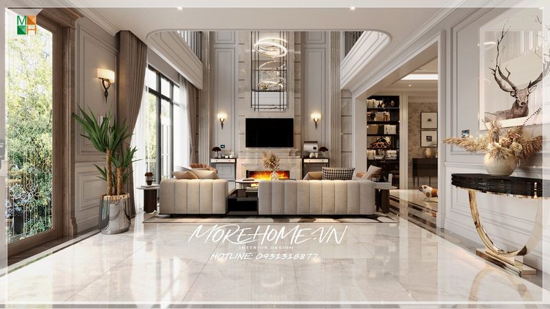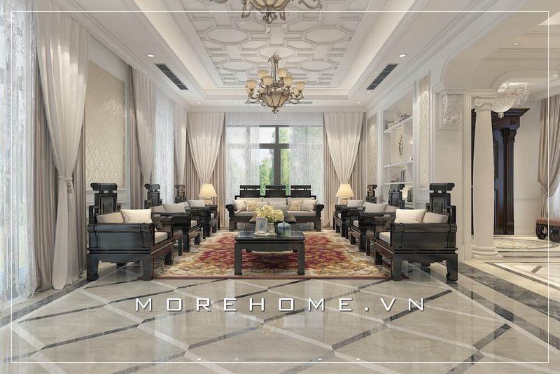 Phòng khách biệt thự theo phong cách tân cổ điển sự dụng hoa văn tròn làm điểm nhấn