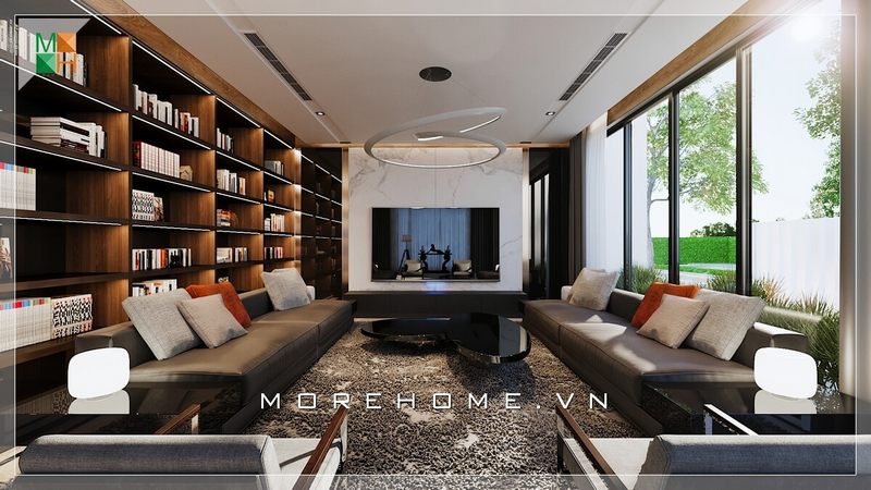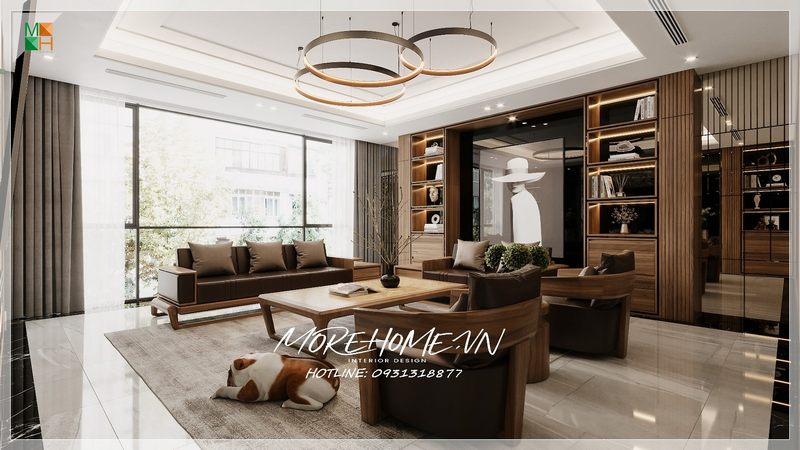 Thiết kế phòng khách của biệt thự, nhà phố cao cấp với hệ thống kính sang trọng và nội thất gỗ óc chó ấn tượng.