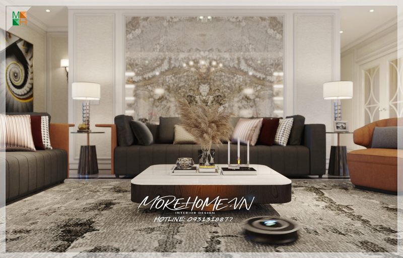 Ấn tượng với chiếc bàn trà đôi được dặt ở vị trí trung tâm của phòng khách đẹp sang trọng và tiện nghi.