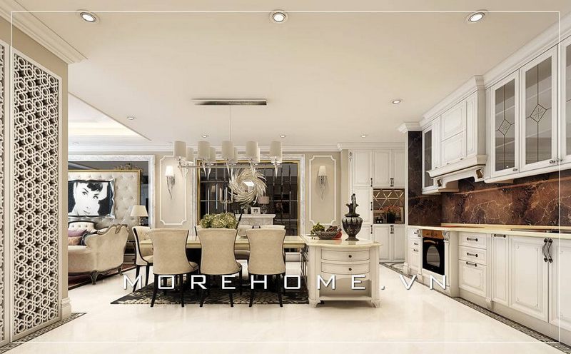 Bàn ăn biệt thự cao cấp với phong cách hiện đại được thiết kế linh hoạt, giúp gia chủ sử dụng được cho nhiều mục đích khác nhau, từ các bữa cơm gia đình thân mật đến các buổi tụ tập bạn bè.