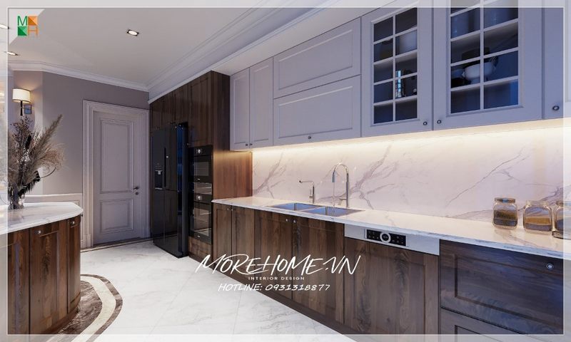 Tủ bếp biệt thự phong cách tân cổ điển góp phần tạo nên không gian sang trọng, tinh tế, khiến khách đến nhà chơi phải khen ngợi về gu thẩm mĩ của gia chủ với những lời trầm trồ.